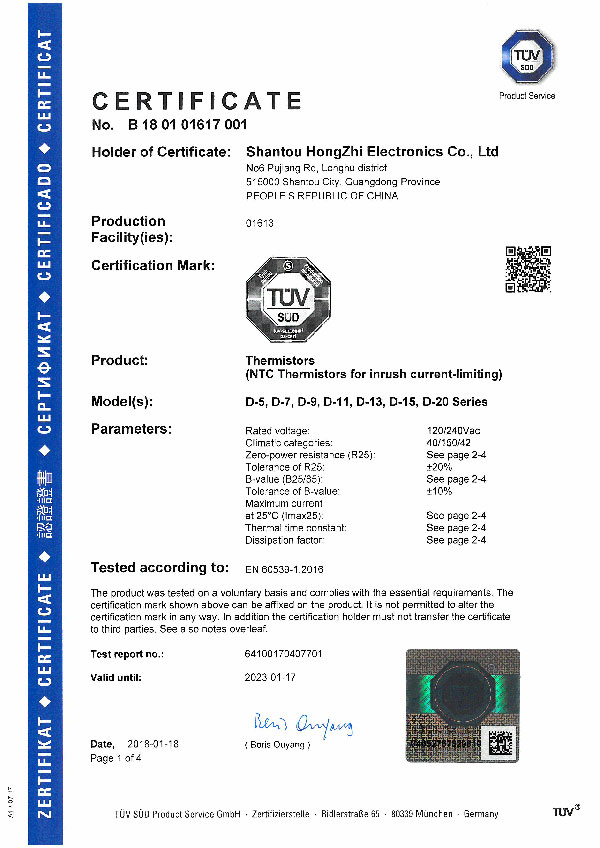 2018年1月,汕頭市鴻志電子有限公司生產(chǎn)的NTC熱敏電阻獲得德國TUV認(rèn)證;至此我司熱敏電阻共有德國TUV.美國UL.中國CQC和美國CUL四個(gè)認(rèn)證。